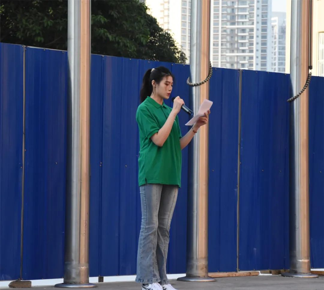 2023级3班文婧同学代表新生作军训表态发言,表示会秉持“亲爱精诚”的校训,在军训中坚决服从教官的指挥,以广艺人的品质、广艺人的气魄、广艺人的精神,高标准、严要求、圆满完成好军训任务。