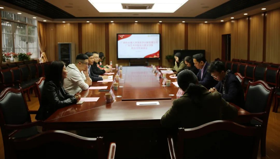 会上,韦春灵总会计师热烈欢迎聂峰辉副总裁一行人到校参观指导,同时介绍了公司的基本情况及办学特点,强调公司一直以来重视校企合作,积极构建合作桥梁,希望双方能充分发挥各自的优势和资源,互利共赢,共同发展。谢斌经理介绍了公司的基本情况以及下一步合作的内容方向。深圳怡亚通供应链股份公司聂峰辉副总裁介绍了公司的基本概况、公司对艺术文化的认识与重视,表示通过校企合作,将促进双方在高等教育行业及企业艺术文化方面的共同发展。
