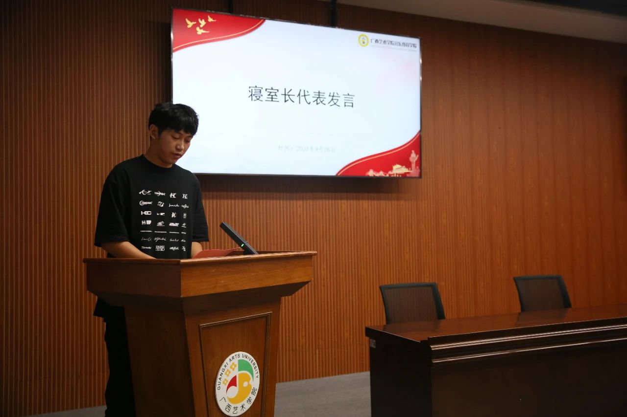 23级王礼政作为宿舍长代表发言中表示宿舍长应有集体荣誉感,积极配合老师开展宿舍管理各项工作,并以身作则,自觉遵守各项规章制度,同学之间互助友爱,携手共进,共同创造一个温馨、和谐、安全的宿舍环境。