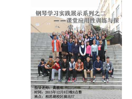 【音乐会预告】黄筱明教师员工音乐会 来源:bv伟德国际1946官网 作者: 发布时间:2015-12-08 18:09:01 浏览次数: 次 【字体:小 大】 黄筱明教师员工音乐会 钢琴学习实践展示系列之二——课堂应用性训练与探索 时间:2015年12月8日晚8:00点 地点:相思湖综合实验楼演出厅 指导老师:黄筱明副教授 欢迎大家的光临! 分享到: 【打印正文】