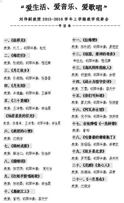 【演艺信息】刘伟副教授2015——2016学年上学期声乐教学观摩会 来源:bv伟德国际1946官网 作者: 发布时间:2016-01-04 15:30:54 浏览次数: 次 【字体:小 大】 刘伟副教授2015——2016学年上学期声乐教学观摩会 时间:1月6日(星期三)晚上7:30 地点:相思湖校区演出厅 分享到: 【打印正文】