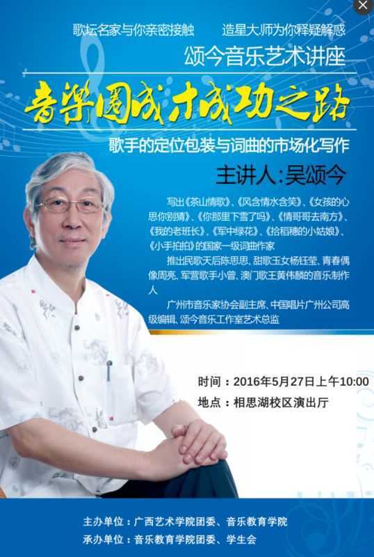 【讲座预告】吴颂今老师音乐艺术讲座——“歌手的定位包装与与词曲的市场化写作” 来源:bv伟德国际1946官网 作者: 发布时间:2016-05-25 00:00:00 浏览次数: 次 【字体:小 大】 吴颂今老师音乐艺术讲座——“歌手的定位包装与与词曲的市场化写作” 时间:2016年5月27(周五)上午10:00 地点:bv伟德国际1946相思湖校区演出厅 欢迎您的光临! 分享到: 【打印正文】