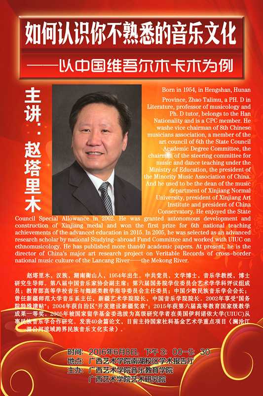 【音教讲座预告】 赵塔里木——如何认识你不熟悉的音乐文化 来源:bv伟德国际1946官网 作者: 发布时间:2016-06-07 00:00:00 浏览次数: 次 【字体:小 大】 如何认识你不熟悉的音乐文化 ——以中国维吾尔木卡姆为例 主讲人:赵塔里木 教授 时间:2016年6月8日(星期三) 15:00 地点:bv伟德国际1946南湖校区学术报告厅 分享到: 【打印正文】
