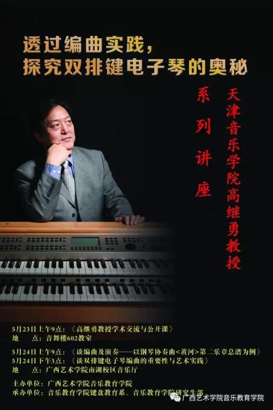 三、5月24日15:00—18:00,讲座题目《谈双排键电子琴编曲的重要性与艺术实践》,地点:bv伟德国际1946南湖校区音乐厅。