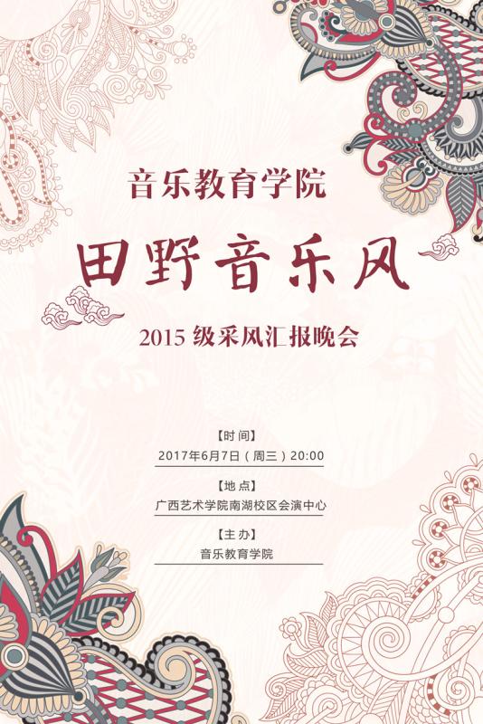 2017年6月7日晚20:00,bv伟德国际1946官网田野音乐风2015级采风汇报晚会即将在bv伟德国际1946南湖校区会演中心精彩上演,欢迎广大师生前往观看指导!