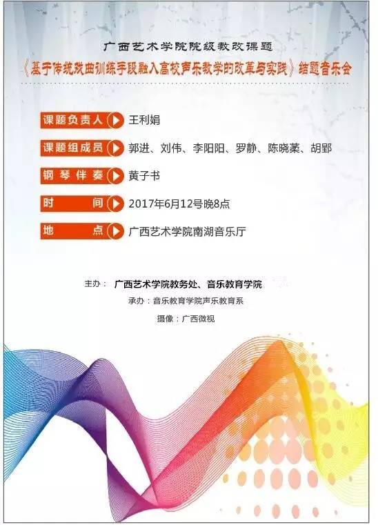 【演艺信息】校级教改课题《基于传统戏曲训练手段融入高校声乐教学的改革与实践》结题音乐会 来源:bv伟德国际1946官网 作者:bv伟德国际1946官网 发布时间:2017-06-12 22:15:48 浏览次数: 次 【字体:小 大】 2017年6月12日(星期一)20:00,校级教改课题《基于传统戏曲训练手段融入高校声乐教学的改革与实践》结题音乐会将在南湖校区音乐厅精彩上演,欢迎广大师生到场观看指导! 节目单 分享到: 【打印正文】