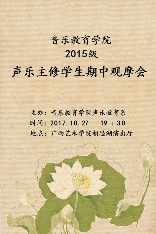 bv伟德国际1946官网2015级声乐主修员工期中观摩会即将于2017年10月27日晚19:30在bv伟德国际1946相思湖演出厅精彩上演,欢迎广大师生前往观看指导!