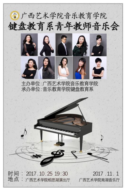 bv伟德国际1946官网键盘教育系教师音乐会即将于2017年11月1日晚20:00在南湖音乐厅精彩上演,欢迎广大师生到场观看指导!