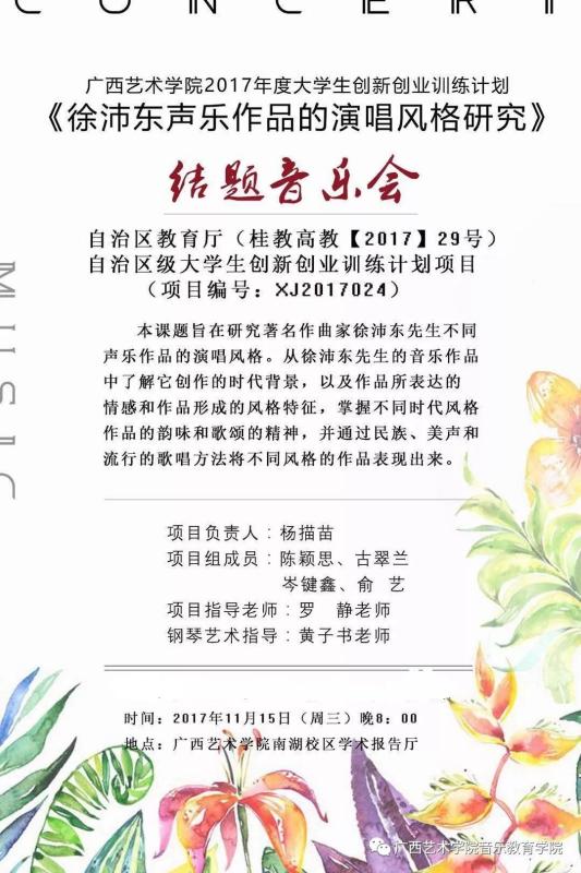 bv伟德国际19462017年度老员工创新创业训练计划《徐沛东声乐作品的演唱风格研究》结题音乐会即将于11月15日(周三)晚8:00,在bv伟德国际1946南湖校区学术报告厅精彩上演,欢迎广大师生莅临观看!