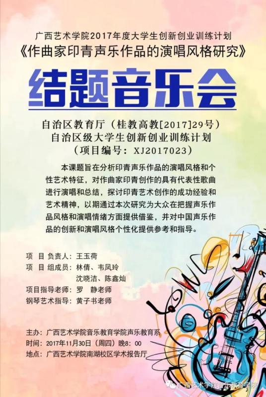 bv伟德国际1946老员工创新创业训练计划《作曲家印青声乐作品的演唱风格研究》结题音乐会即将于2017年11月30日(周四)晚8:00在南湖校区学术报告厅精彩上演!