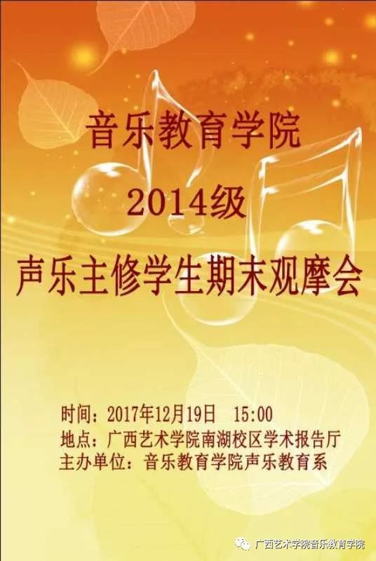 2014级声乐主修员工期末观摩会即将于2017年12月19日 15:00在bv伟德国际1946南湖校区学术报告厅精彩上演,欢迎广大师生莅临现场观看指导!