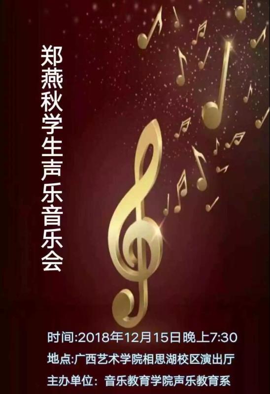 bv伟德国际1946官网郑燕秋员工声乐音乐会即将于2018年12月15日晚上7:30在bv伟德国际1946相思湖校区演出厅精彩上演,欢迎广大师生前往观看指导!