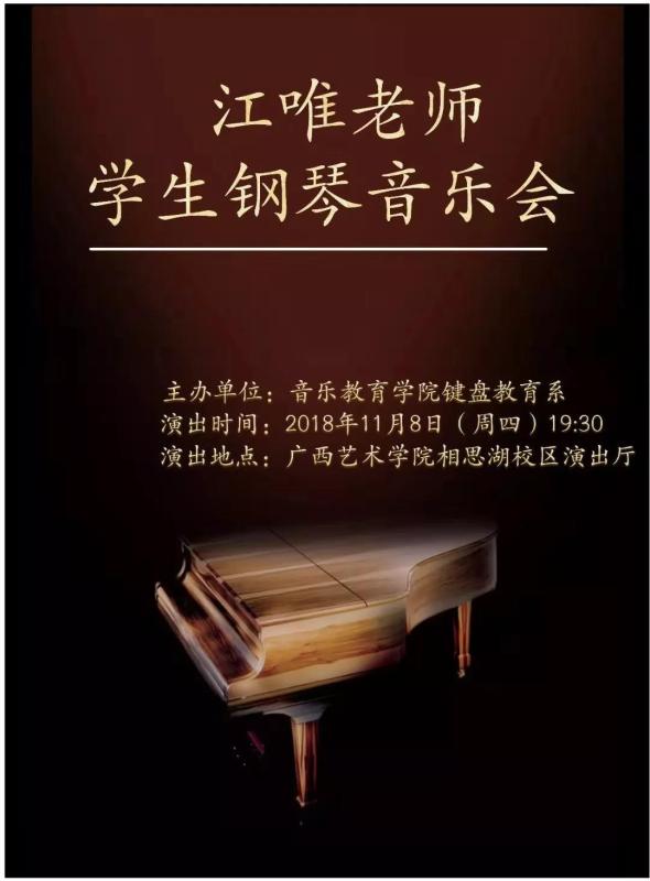 bv伟德国际1946官网江唯老师员工钢琴音乐会即将于2018年11月8日19:30在bv伟德国际1946相思湖校区演出厅精彩上演,欢迎广大师生前往观看指导!