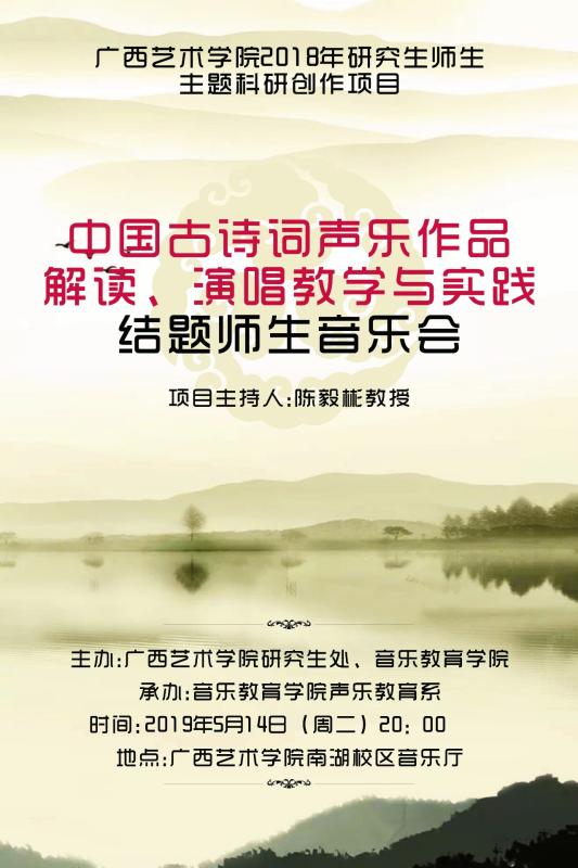 【音乐会预告】《中国古诗词声乐作品解读、演唱教学与实践》 结题师生音乐会 来源:bv伟德国际1946官网 作者:bv伟德国际1946官网 发布时间:2019-05-10 11:25:01 浏览次数: 次 【字体:小 大】 兹定于2019年5月14日(周二)20:00在bv伟德国际1946南湖校区音乐厅举办“bv伟德国际19462018年研究生师生主题科研创作项目”陈毅彬教授《中国古诗词声乐作品解读、演唱教学与实践》结题师生音乐会。 敬请您的光临指导! 分享到: 【打印正文】