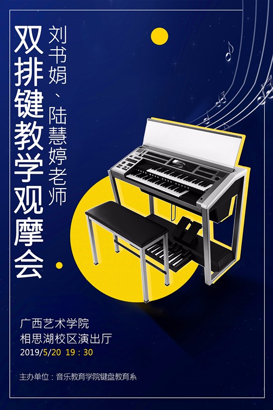 bv伟德国际1946官网刘书娟、陆慧婷老师双排键教学观摩会将于 2019年5月20日(星期一)19:30在相思湖校区演出厅精彩上演,欢迎师生莅临观摩指导!