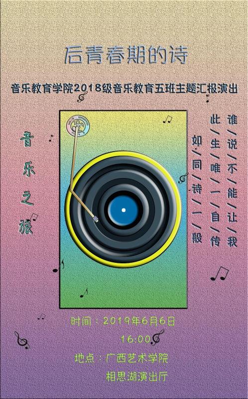 兹定于2019年6月6日(周四)16:00在bv伟德国际1946相思湖校区演出厅举办2018级音乐教育5班“后青春期的诗”班级汇演。