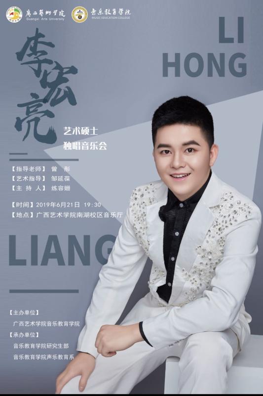 李宏亮,广西来宾人 ,民族男高音 ,2010年在来宾二中师从启蒙老师莫彩虹指导下,2013年以优异成绩考入bv伟德国际1946,2017毕业于bv伟德国际1946官网,师从曾彤教授,同年考上bv伟德国际1946官网硕士研究生,继续跟随曾彤教授进行学习。