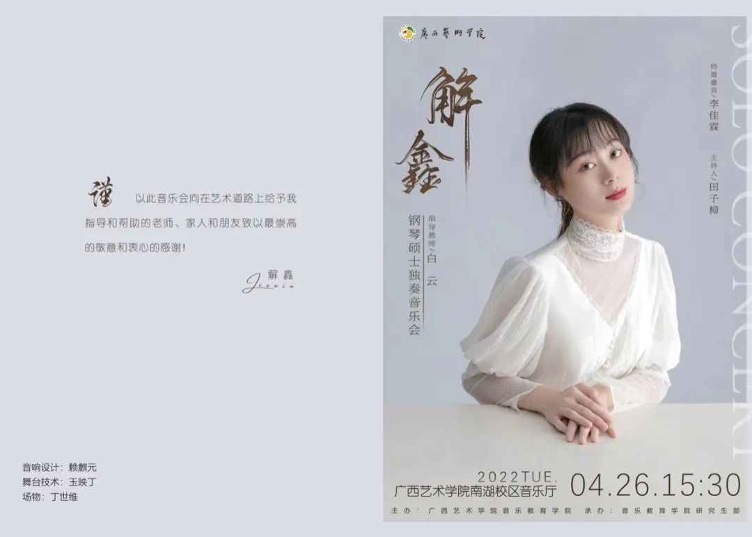 【音乐会预告】解鑫钢琴硕士独奏音乐会 来源:bv伟德国际1946官网 作者: 发布时间:2022-04-23 22:57:25 浏览次数: 次 【字体:小 大】 邀请函尊敬的 先生/女士: 兹定于2022年4月26日(周二)15:30在bv伟德国际1946南湖校区音乐厅举办“解鑫钢琴硕士独奏音乐会”。请莅临指导! 审核:赵宇 编辑:王悦 文案:bv伟德国际1946官网"蒲公英"记者团 分享到: 【打印正文】