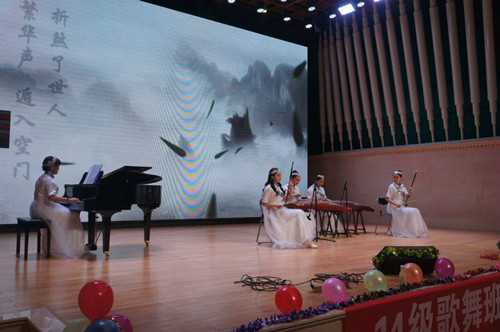 汇演于2016年1月开始筹备,经过两个多月紧锣密鼓的排练,终于向观众呈现了一场节目内容形式多样的晚会。晚会共分为“为你歌唱”和“歌舞飞扬”两个篇章。第一篇章的《在那遥远的地方》、《敖包相会》、《请别忘了我》等好多首艺术歌曲联唱,带领观众在艺术的海洋里遨游,第二篇章的民乐演奏《烟花易冷》、唱跳歌曲《爱投罗网》、民歌《柳州姑娘爱梳头》等一系列歌舞表演更是将整场晚会推向了高潮,赢得了现场阵阵掌声,受到了同学们的好评。掌声和欢呼声此起彼伏,台上台下成了一片激情四射的海洋,2014级歌舞表演1班用他们真诚的表演和热情的歌唱表达了他们对专业的热爱。