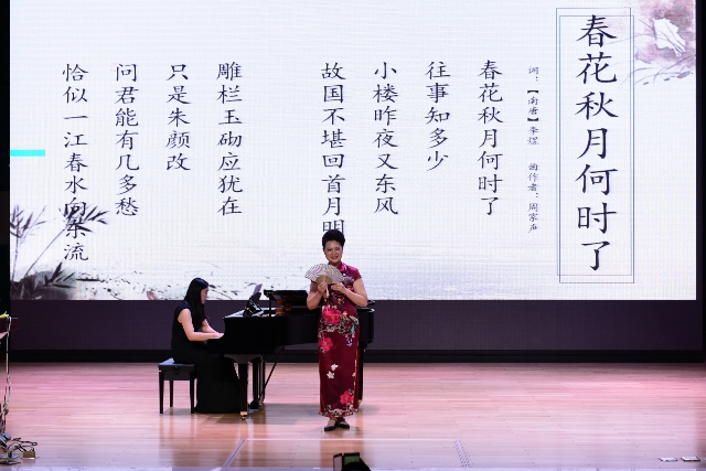 陈毅彬教授在演出开始前简单给大家介绍了关于中国古诗词声乐的特点,接着便以一首《枫桥夜泊》拉开了音乐会的序幕。在第二个节目中,陈教授先是请研究生唱了《花非花》这首古诗声乐作品,并进行了现场点评,她表示演唱古诗词声乐时要平仄律动、字腔清朗,把握神韵,深情并茂。在接下来的《阳关三叠》《点绛唇·赋登楼》《关雎》《峨眉山月歌》《如梦令》《大江东去》《我住长江头》等作品中,陈教授都对表演的员工们进行了细致的点评和范唱,还不时地跟现场的观众互动。在音乐会最后,陈教授为大家深情演唱了一首《春花秋月何时了》,得到了现场观众热烈的掌声。