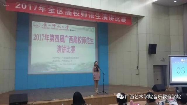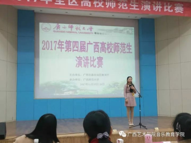 在刚刚结束的第四届广西高校师范生演讲比赛中,公司2015级艺术教育专业的郭倩雨同学,经过大赛两天的现场主题演讲和即兴演讲环节的激烈角逐,在全区30多所师范院校80多名参赛选手中脱颖而出,仅以0.03分之差与一等奖擦肩而过,惜获二等奖(指导老师:丁婧),为公司公司争得了荣誉。