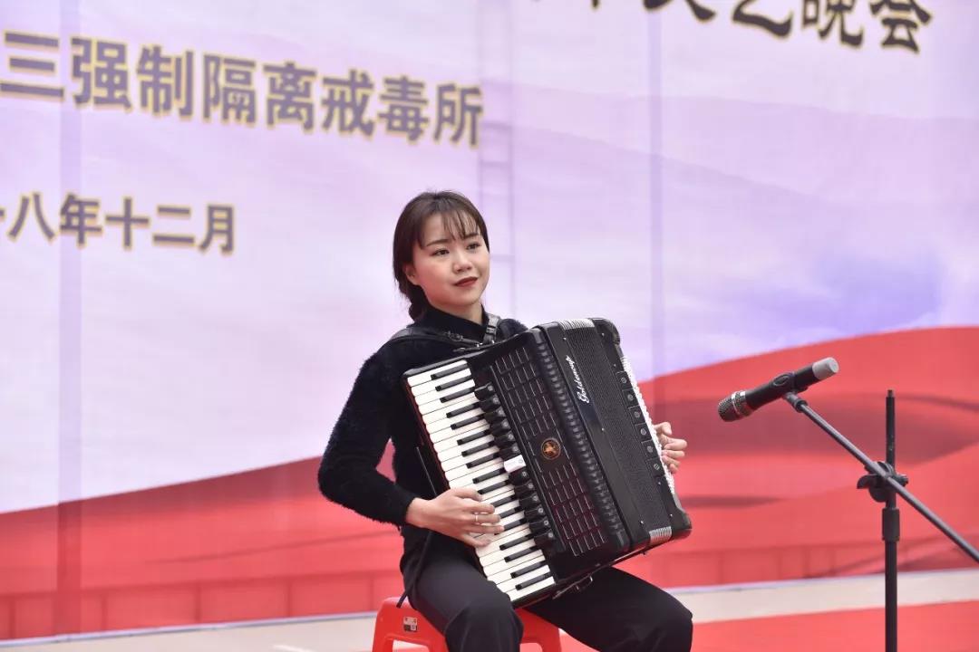 在比赛过程中,各大队戒毒人员纷纷登台演唱、朗诵,歌颂党,歌颂祖国,体现出欢乐和谐的场所文化氛围。大合唱声音洪亮,一首首爱国歌曲,一片片赤子情怀,朗诵铿锵有力,颂出爱国的主旋律,庆祝广西壮族自治区成立60周年。公司员工除了担任合唱比赛的伴奏,还为大家带来了精彩的节目,古筝独奏《战台风》、男声独唱《红旗飘飘》《把一切献给党》、手风琴独奏《舞会波尔卡》等节目赢得大家阵阵掌声。比赛结束后,强制隔离戒毒所的领导表达了对公司师生此次帮教、参演活动的感谢之情,正是由于手风琴的伴奏和同学们的耐心指导,使得参演人员在有限的排练时间里,将节目的水平提升到一个新的高度,进一步增强了参演人员的积极性。