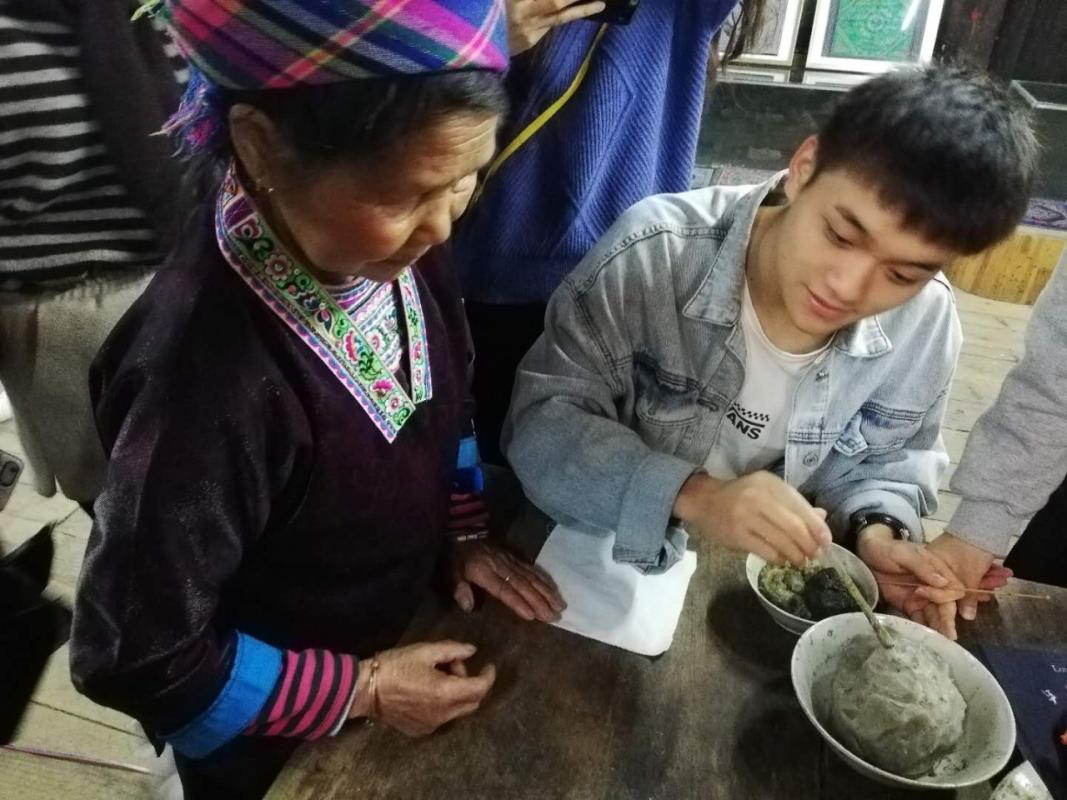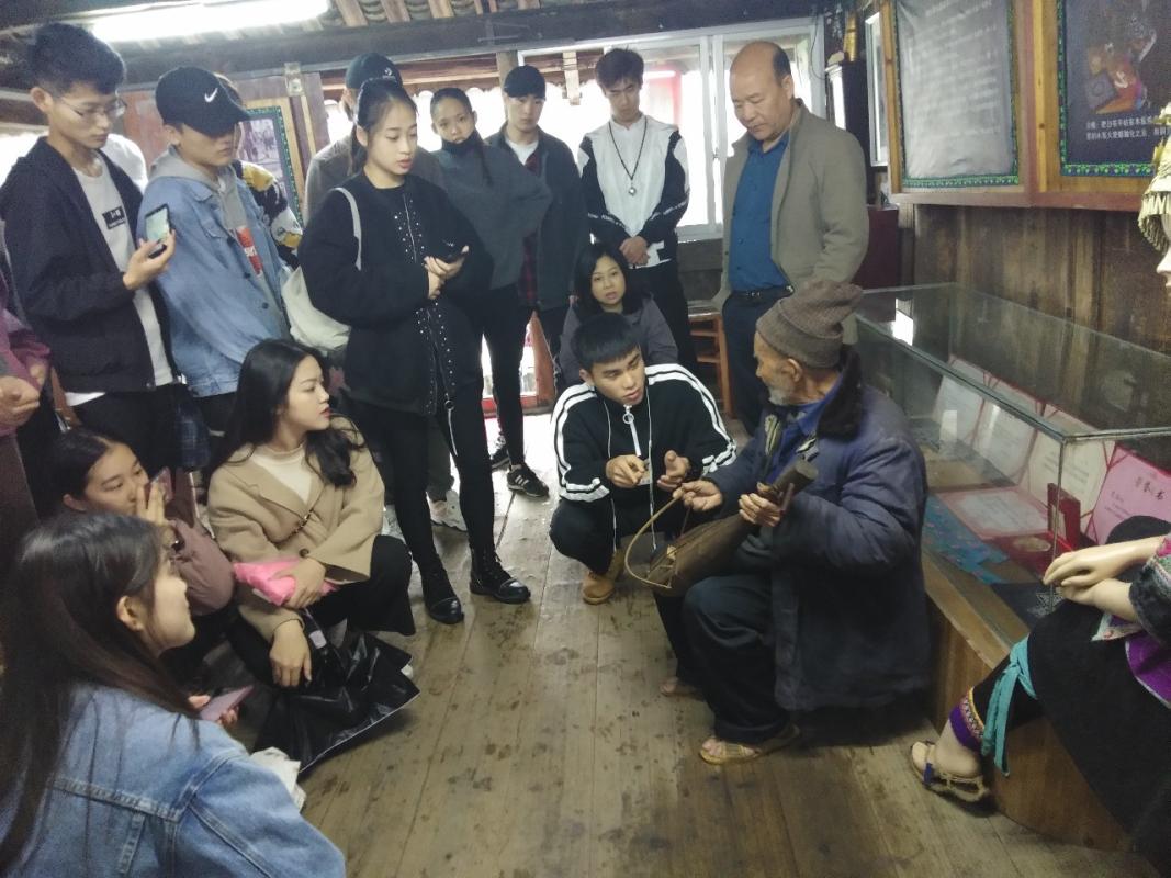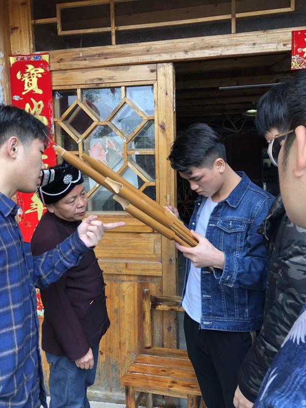 同学们向当地老爷爷学习民间乐器芦笙的演奏方法