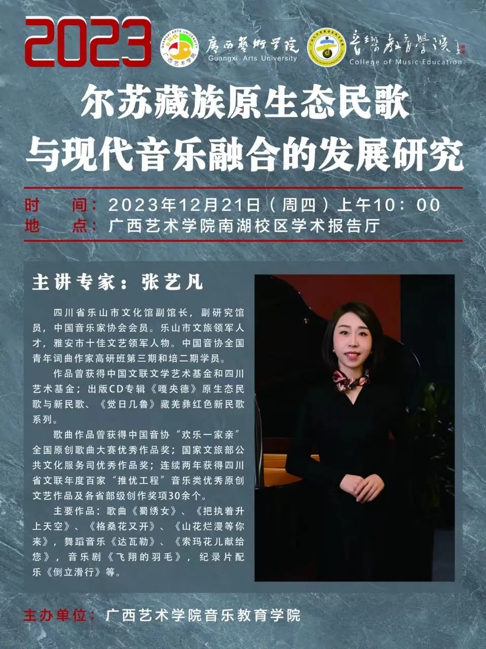 【2023学术活动预告】尔苏藏族原生态民歌与现代音乐融合的发展研究 来源:bv伟德国际1946官网 作者: 发布时间:2023-12-20 12:40:56 浏览次数: 次 【字体:小 大】 尔苏藏族原生态民歌与现代音乐融合的发展研究主讲专家:张艺凡时间:2023年12月21日(周四)上午10:00地点:bv伟德国际1946南湖校区学术报告厅尔苏藏族原生态民歌展演节目单 1.觉里曼姆表演者:苏正琼、王丽梦、洛桑妮玛、王勇 2.勒思泽(洗簸箕)表演者:苏正琼、王丽梦、唐伟欣 3.萨里昂多曼表演者:姜英、洛绒、山丹梅 4.情歌表演者:洛桑妮玛、唐伟欣 5.阿瓦尕(蜜蜂报信)表演者:王丽梦、唐伟欣 6.哭嫁歌表演者:苏正琼、王丽梦 7.母亲表演者:苏正琼、唐伟欣 8.瓦曼依哇表演者:全体女同志 9.喔呀哩勒表演者:苏正琼、姜英、吴迎霞、骆平 10.劳动歌表演者:洛桑妮玛、王勇、姜英、洛绒 11.迎客歌表演者:姜英、洛绒、山丹梅新民歌展演节目单 1.环山鸡节歌(改编:陈川)表演者:洛桑妮玛、王勇 2.祈祷(改编:韩兆云)表演者:洛桑妮玛 3.格桑花又开(作词:刘柏峻 作曲:张艺凡)表演者:洛桑妮玛、王勇、洛绒 4.心手相牵(作词:刘柏峻、山丹梅 作曲:张艺凡)表演者:王丽梦、洛绒 5.阿妈的勒思泽(改编:张艺凡)表演者:王丽梦、唐伟欣、洛绒、姜英 终审:戴丽霞 初审:赵海生 编辑:窦晟元 文案:bv伟德国际1946官网“蒲公英”记者团 分享到: 【打印正文】